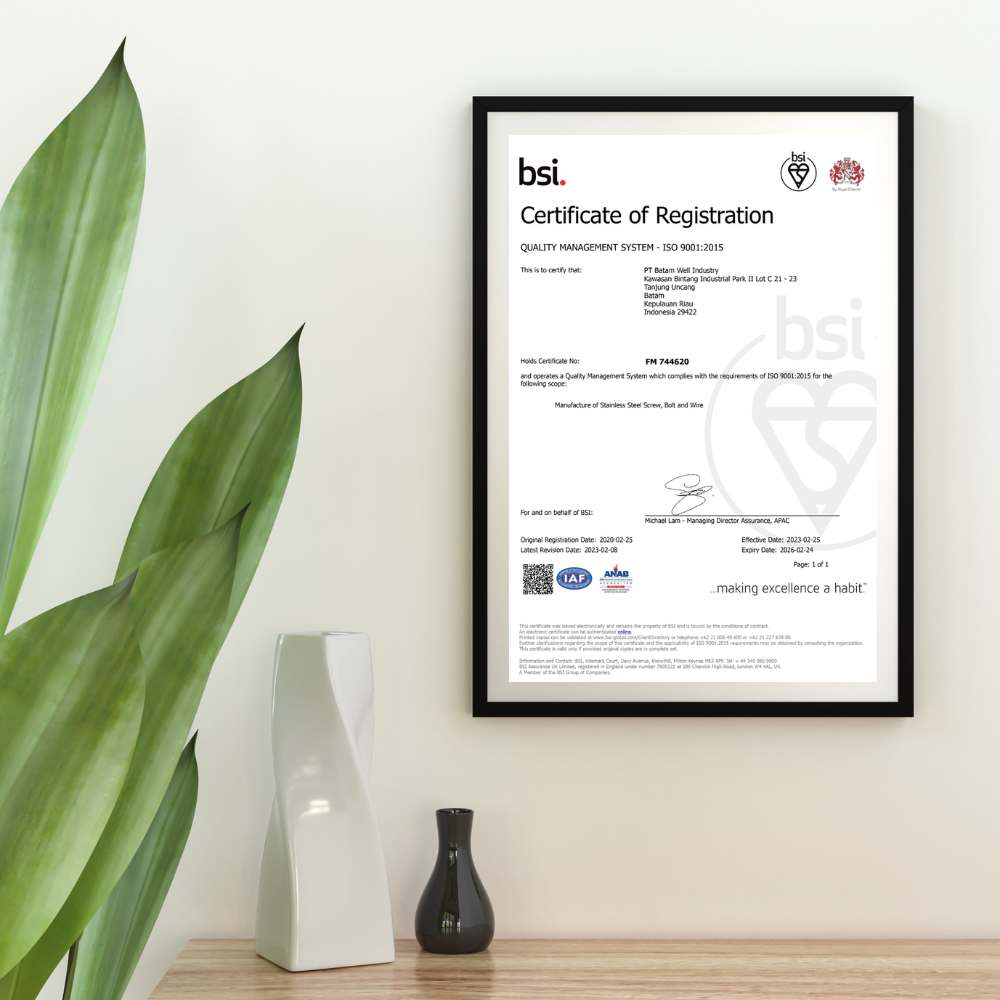 Trusted Since 2011 – PT Batam Well Industry A certified manufacturer of high-quality stainless steel screws and bolts, based in Batam, Indonesia. We offer standard and custom solutions in grades A2, A4, SS410, and SS550 — all produced 100% in-house. Serving clients across Europe, the Americas, Asia, and Australia with ISO 9001, ISO 14001, and BSCI-certified quality.